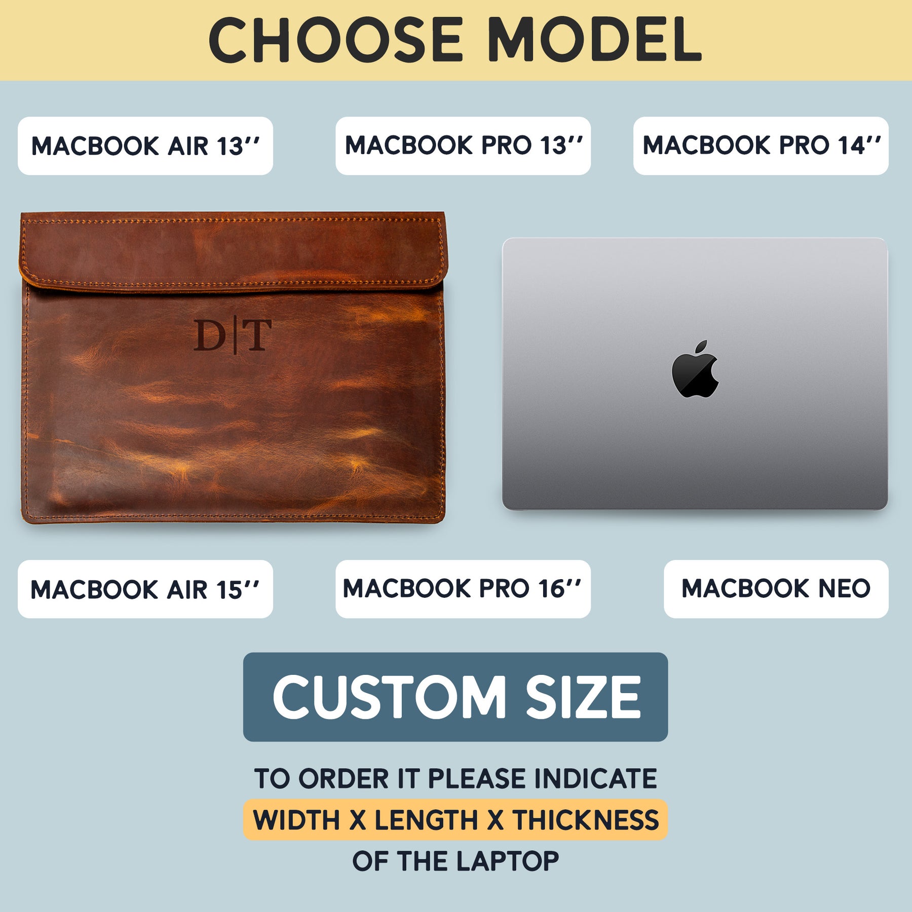 Or choose a custom size, handcrafted to match your laptop’s exact dimensions.